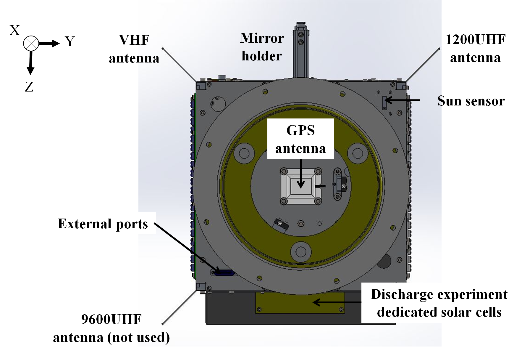 The UHF antennas, the VHF antenna, and the arm holding the mirror are fixed, which makes HORYU-IV a deployment-free nano-satellite.